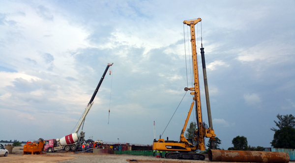 文萊PMB跨海大橋首根試樁鉆孔直徑1.5m,鉆孔深度68.6m,灌注混凝土120方。試樁內(nèi)裝有“荷載箱”兩組,鋼筋應(yīng)力計52組。通過技術(shù)攻關(guān),首根試樁的鉆孔垂直度、泥漿參數(shù)、沉渣厚度等指標(biāo)均滿足歐標(biāo)要求,順利通過總包、監(jiān)理驗收。尤其是混凝土灌注施工,有了鉆孔質(zhì)量的保證,混凝土灌注導(dǎo)管自由的在布設(shè)有兩組關(guān)卡的“荷載箱”內(nèi)安放、提拔,獲得了總包方和監(jiān)理方稱贊,監(jiān)理工程師向我們豎起了大拇指。我們以一流的管理、先進(jìn)的設(shè)備、精湛的技術(shù),進(jìn)一步擦亮了“河北建勘”品牌。