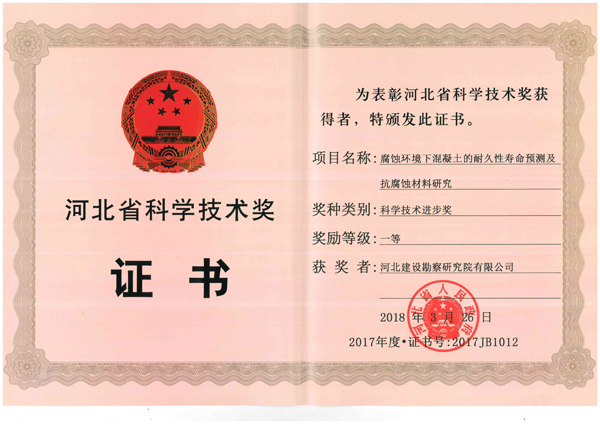 5月30日上午,河北省科學技術獎勵暨慶祝“全國科技工作者日”大會在石家莊舉行。省委書記王東峰、省長許勤等省領導出席大會,并為榮獲2017年度河北省科學技術獎勵代表和第十屆河北省優秀科技工作者代表頒發證書。我公司《腐蝕環境下混凝土的耐久性壽命預測及抗腐蝕材料研究》獲省科技進步一等獎、《素混凝土剛性樁復合地基核心技術研究與工程應用》獲三等獎,聶慶科總工程師代表公司參加了大會并上臺領獎。這是我公司繼2014、2015年度后再獲河北省科技進步一等獎,對我們既是極大鼓舞和肯定,也必將激勵和鞭策廣大專業技術人員,以黨的十九大精神和習總書記在兩院院士大會講話精神為指引,積極投身創新實踐,大力開展科研攻關,為不斷推進巖土工程技術發展、提升企業創新能力和核心競爭力而繼續努力奮斗。