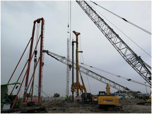 該項目于2018年3月10日開工,2018年9月2日竣工,共計完成直徑600mm鉆孔灌注樁1250根,樁長為30.15m,混凝土方量10650m³,高峰期時投入旋挖鉆機3臺套,回轉鉆機5臺套。