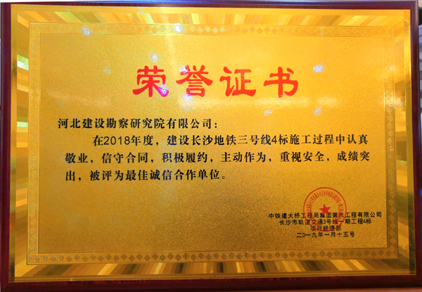 我公司承建的長沙地鐵三號線4標施工監測項目,自開工以來精心策劃、有效組織、認真施工、積極與業主配合。施工過程中我公司認真敬業,信守合同,積極履約,主動作為,重視安全,成績突出,中鐵建大橋工程局集團特授予我公司 “最佳誠信合作單位”榮譽獎牌,以示表彰!