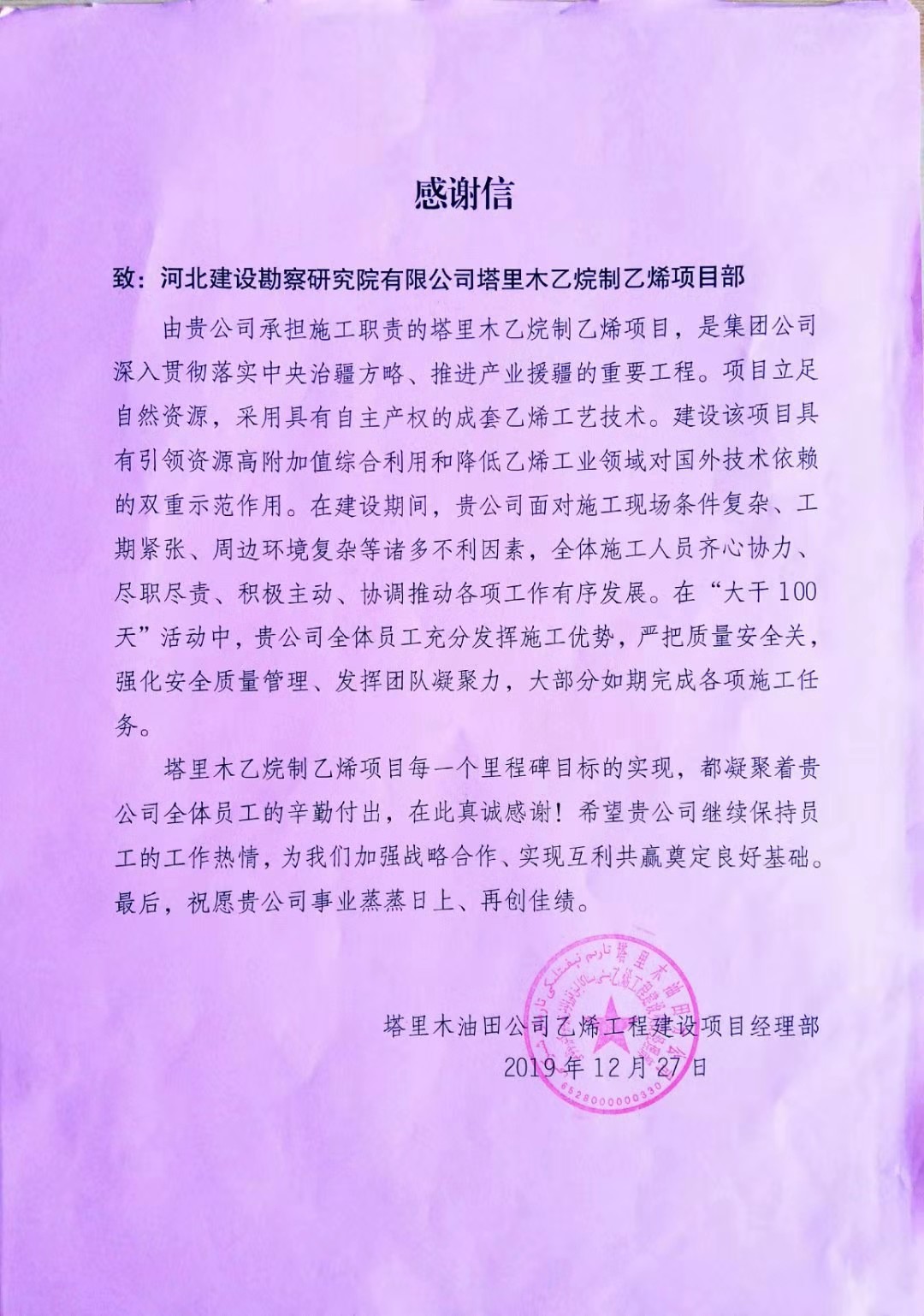 公司近日收到業主塔里木油田公司乙烯工程建設項目經理部的感謝信及中國寰球工程有限公司北京分公司的質量管理先進集體錦旗。在建設期間,我公司面對現場條件復雜、工期緊張等諸多不利因素,全體施工人員齊心協力、盡職盡責、積極主動、協調推動各工作有序開展,在施工中,嚴把質量安全觀、強化安全質量管理、發揮團隊凝聚力,很好的完成了各項施工任務,為雙方進一步加強戰略合作、實現互利共贏奠定了良好基礎。