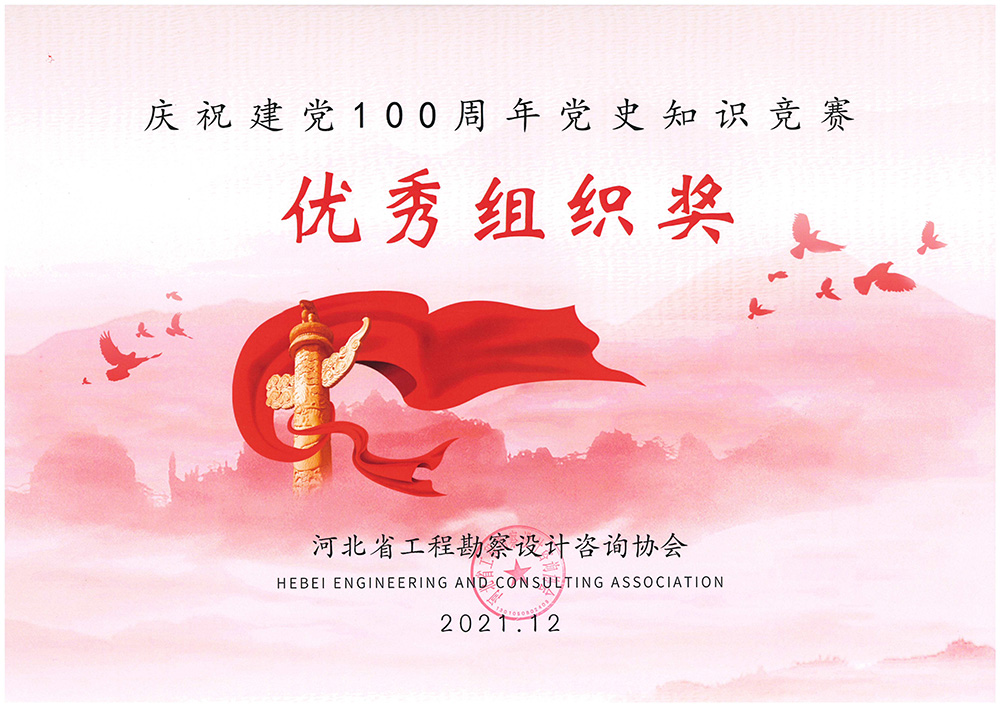 2021年,為隆重慶祝中國共產(chǎn)黨成立 100 周年,號召廣大黨員群眾進一步了解黨的百年奮斗史,以史為鑒,砥礪前行,為行業(yè)高質(zhì)量發(fā)展作出積極貢獻,河北省工程勘察設(shè)計咨詢協(xié)會主辦了以“重溫黨史,不忘初心”為主題的黨史知識學(xué)習(xí)競賽活動。公司黨委組織公司廣大黨員群眾積極踴躍參加,并取得較好學(xué)習(xí)效果。近日,被河北省工程勘察設(shè)計咨詢協(xié)會授予“優(yōu)秀組織獎”。