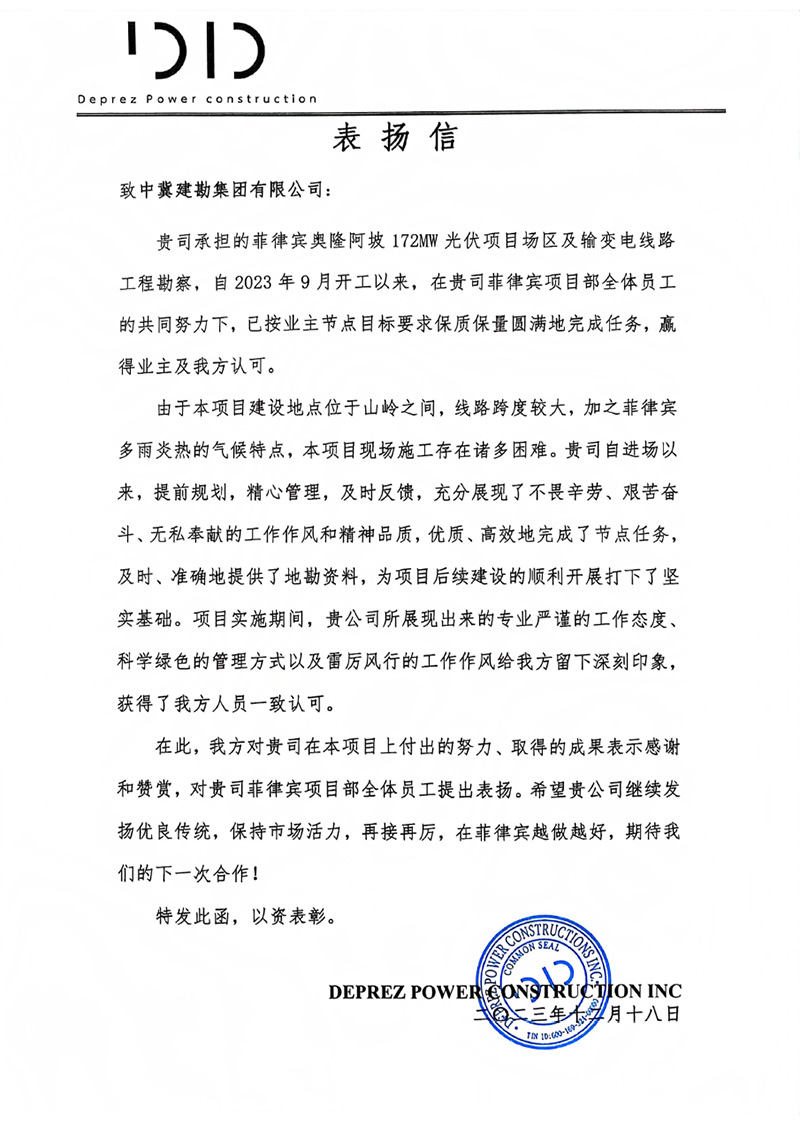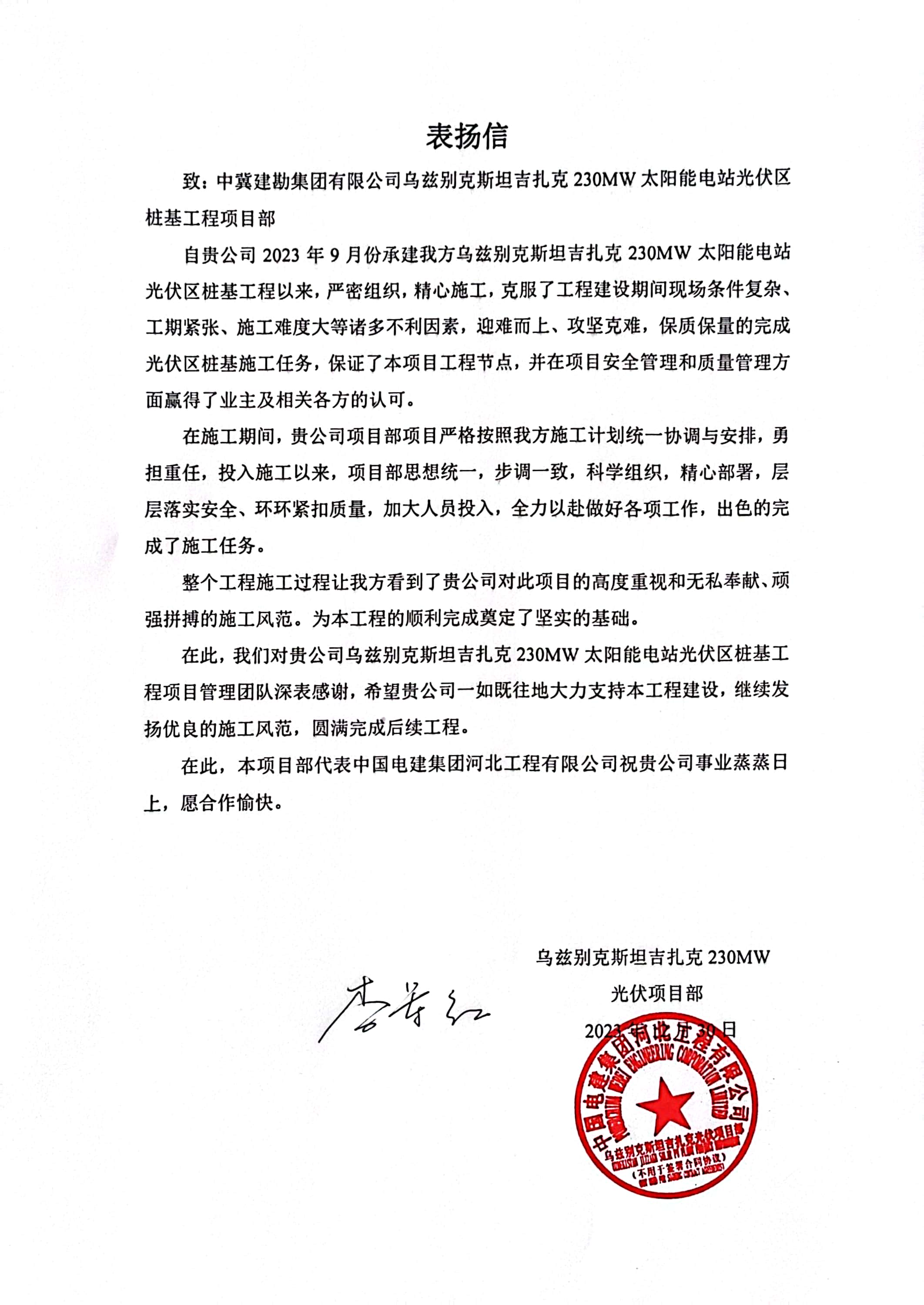 中國電建集團(tuán)河北工程有限公司發(fā)來的表揚(yáng)信,對在烏茲別克斯坦吉扎克230MW太陽能電站光伏項(xiàng)目施工期間,項(xiàng)目部思想統(tǒng)一,科學(xué)組織,精心部署,層層落實(shí)安全、環(huán)環(huán)緊扣質(zhì)量,全力以赴做好各項(xiàng)工作的奮斗精神,給予了高度評價(jià)和感謝。