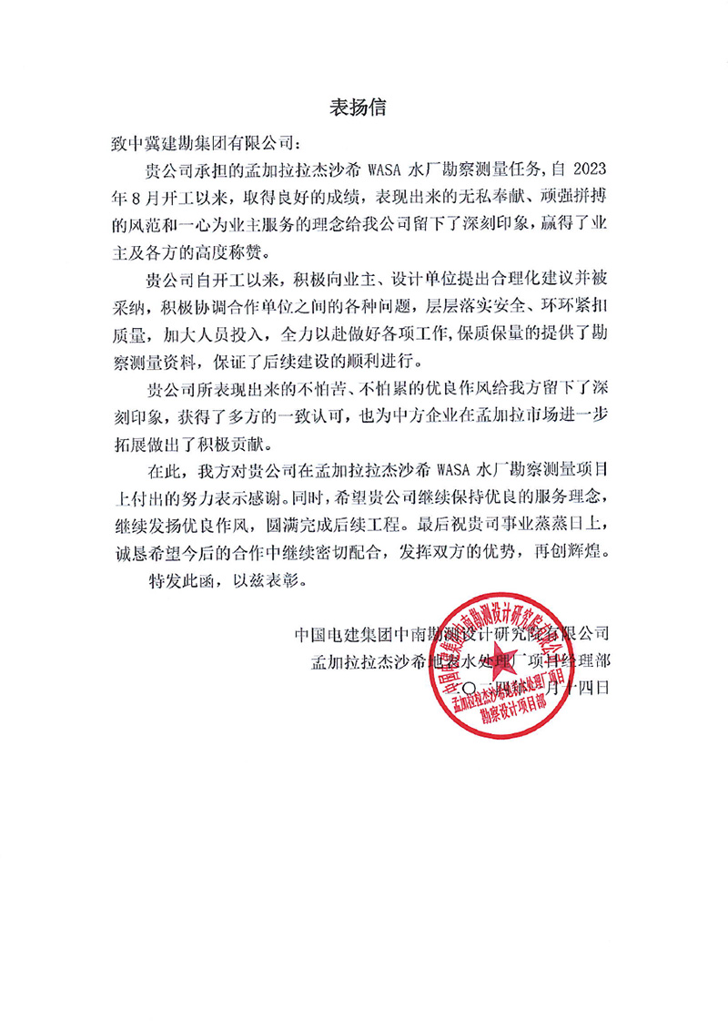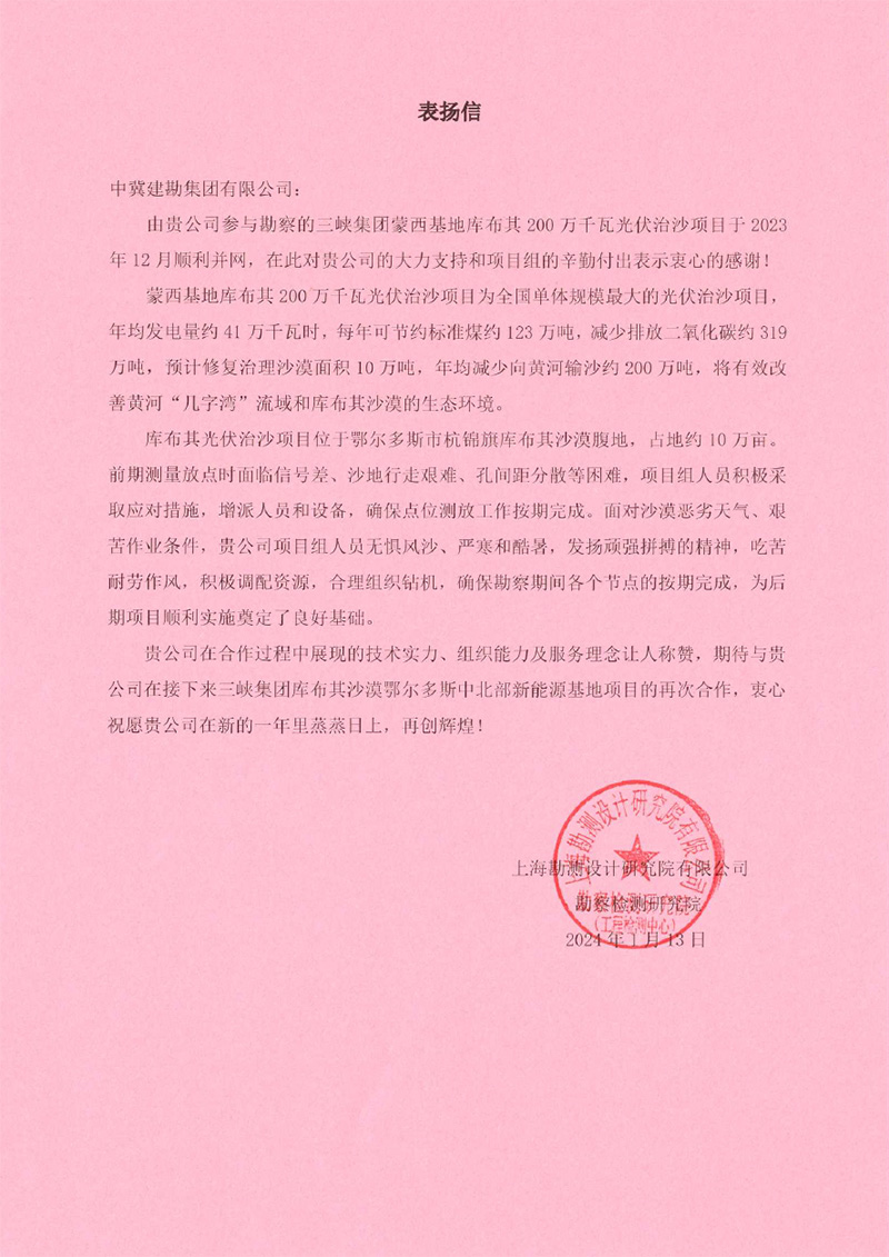 中國機(jī)械設(shè)備工程股份有限公司發(fā)來的表揚(yáng)信,對在烏茲別克斯坦謝拉巴德 500MWp/456.6MWac 太陽能電站項(xiàng)目建設(shè)過程中,項(xiàng)目全體人員克服諸多不利因素,發(fā)揚(yáng)建勘精神,盡一切努力推進(jìn)工程建設(shè),以及公司的專業(yè)性、敬業(yè)態(tài)度和管理水平給予了高度評價(jià)。同時(shí),對項(xiàng)目管理團(tuán)隊(duì)及所有參建人員表示由衷的感謝,并希望雙方精誠合作,攜手并進(jìn),共同推進(jìn)其他項(xiàng)目的開發(fā)建設(shè)。