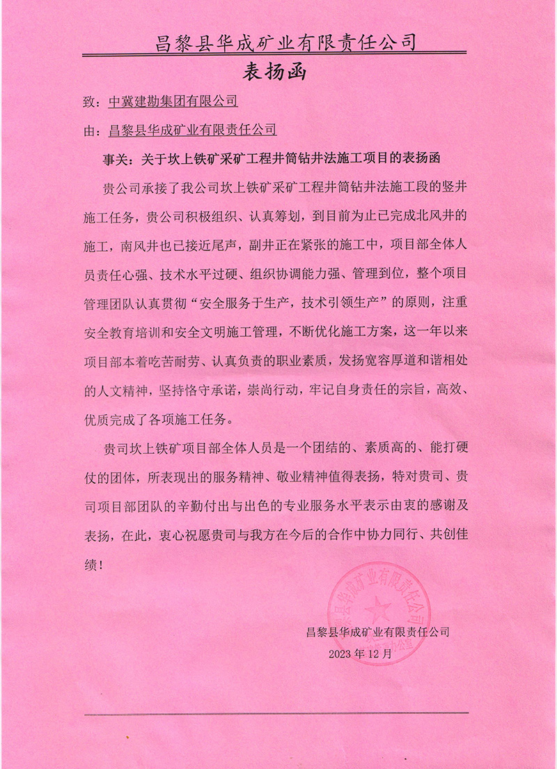昌黎縣華成礦業(yè)有限責(zé)任公司發(fā)來的表揚(yáng)函,對我公司在坎上鐵礦采礦工程井筒鉆進(jìn)法施工項(xiàng)目施工過程中,積極組織,認(rèn)真籌劃,以及項(xiàng)目部全體人員責(zé)任心強(qiáng)、技術(shù)水平過硬、組織協(xié)調(diào)能力強(qiáng)、管理到位,認(rèn)真貫徹“安全服務(wù)于生產(chǎn),技術(shù)引領(lǐng)生產(chǎn)”的原則,不斷優(yōu)化施工方案,已順利完成北風(fēng)井的施工,南風(fēng)井也即將完成,表示由衷的感謝和表揚(yáng),希望今后合作中協(xié)力同行、共創(chuàng)佳績。