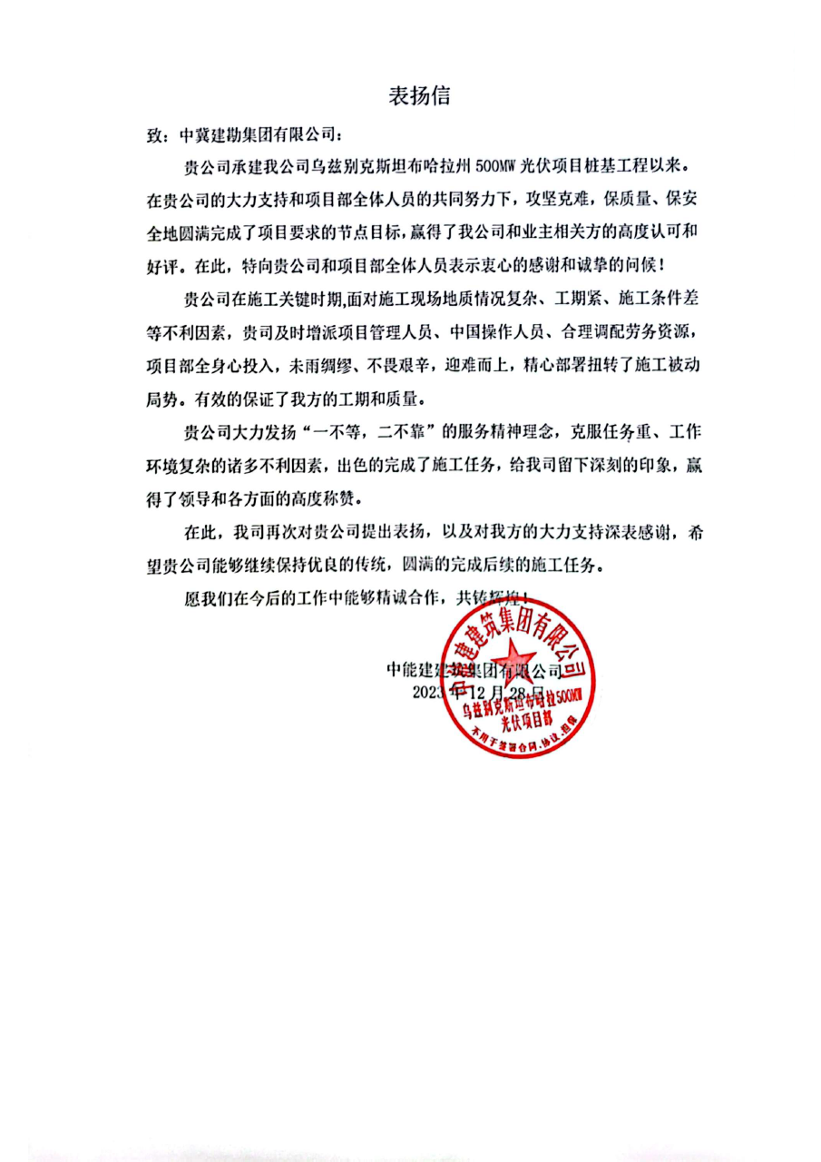 中能建建筑集團(tuán)有限公司發(fā)來的表揚(yáng)信,對在烏茲別克斯坦布哈拉州500MW光伏項(xiàng)目建設(shè)過程中,項(xiàng)目部全體人員發(fā)揚(yáng)“一不等,二不靠”的服務(wù)理念,克服工作環(huán)境和地質(zhì)復(fù)雜等困難,在公司的大力支持和項(xiàng)目全體人員的共同努力下,圓滿完成了項(xiàng)目要求的節(jié)點(diǎn)目標(biāo),特向我公司表示衷心的感謝和誠摯的問候,愿今后繼續(xù)精誠合作,共鑄輝煌。