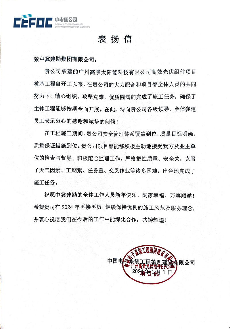 中國電子系統(tǒng)工程第四建設(shè)有限公司發(fā)來的表揚(yáng)信,對我公司在廣州高景太陽能科技有限公司高效光伏組件項(xiàng)目建設(shè)過程中,公司的大力配合和項(xiàng)目部全體人員的共同努力下,安全管理體系覆蓋到位,質(zhì)量保證措施到位,嚴(yán)格把控質(zhì)量、安全關(guān),出色完成了施工任務(wù),特向我公司各級領(lǐng)導(dǎo)、全體參建員工表示衷心的感謝,并授予“優(yōu)秀安全管理團(tuán)隊(duì)”和“優(yōu)秀資料包商”榮譽(yù)。